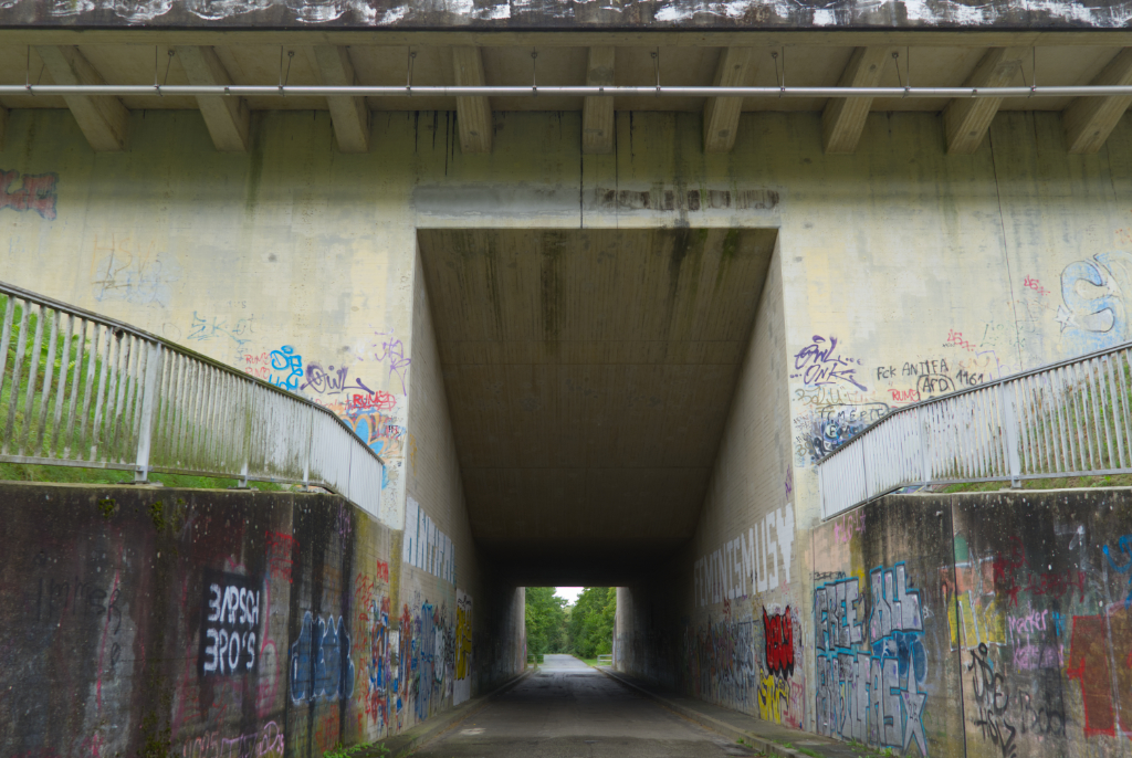 Trogbrücke des Mittellangkanals über einen Wirtschaftsweg. Das Kanalprofil ist deutlich erkennbar. Hier brach 1976, 33 Tage nach Einweihung, der Trog und das Wasser lief aus dem Kanal.