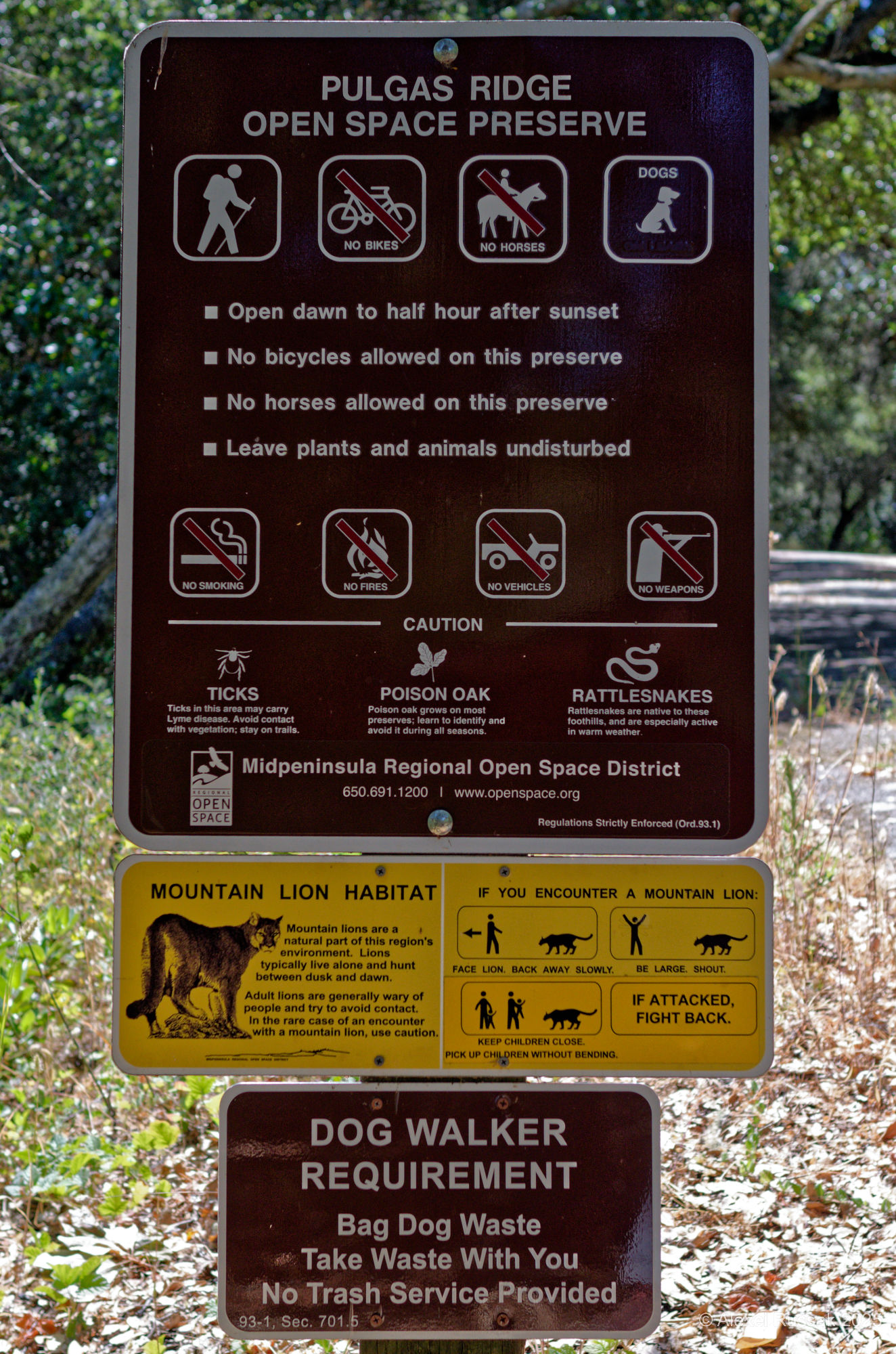 Dieses Schild habe ich in einem Naturschutzgebiet im Silicon Valley, Kalifornien, gesehen. Das Naturschutzgebiet hat Öffnungszeiten, aber keine Einlasskontrolle. Man darf dort wandern und seine Hunde mitbringen. Reiten, Radfahren, Rauchen, offenes Feuer und Fahrzeuge aller Art sind nicht erlaubt. Ebenso das Mitführen von Schußwaffen 😳