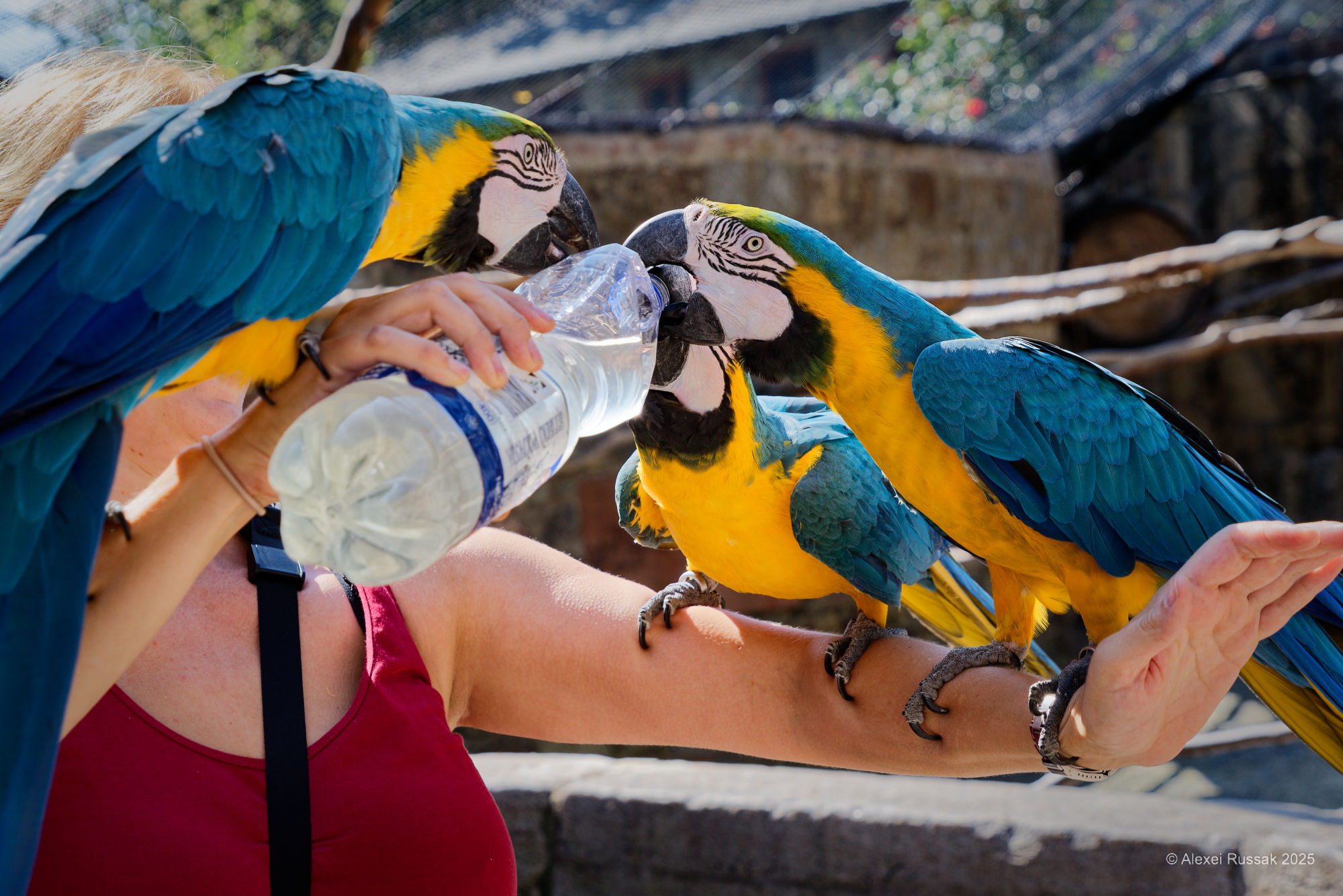 Etwa 50 Km Nordwestlich von Frankfurt, mitten im Taunus, liegt die Vogelburg. Sie ist Heimat für dutzende Aras, Sittiche und anderer Papageienarten. Sie sind fast alle handzahm und lieben es mit den Besuchern zu interagieren. Die großzügigen Volieren kann man betreten und so direkt die Vögel erleben. Wobei die Aras ihre eigenen Vorstellung haben, was sie vom Besucher erwarten. Hier war es meine Wasserflasche. Ich habe mich nicht lange gewehrt und die Flasche rausgerückt. Keine zwei Minuten später war der Verschluss ab...