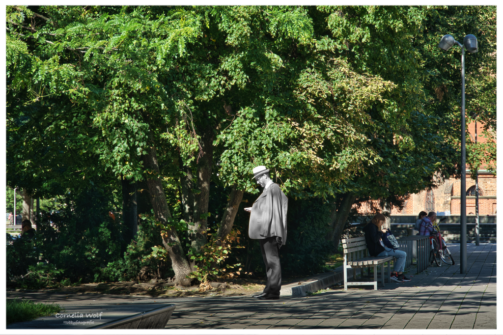 Ich habe das Foto "Mann in Grau" betitelt. Er ist im Prinzip nicht anwesend, schaut auf sein Handy und bekommt von seiner Umwelt nichts mit.