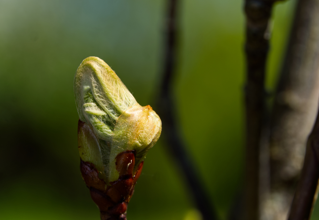 Buchenknospe mit altem Blatt.