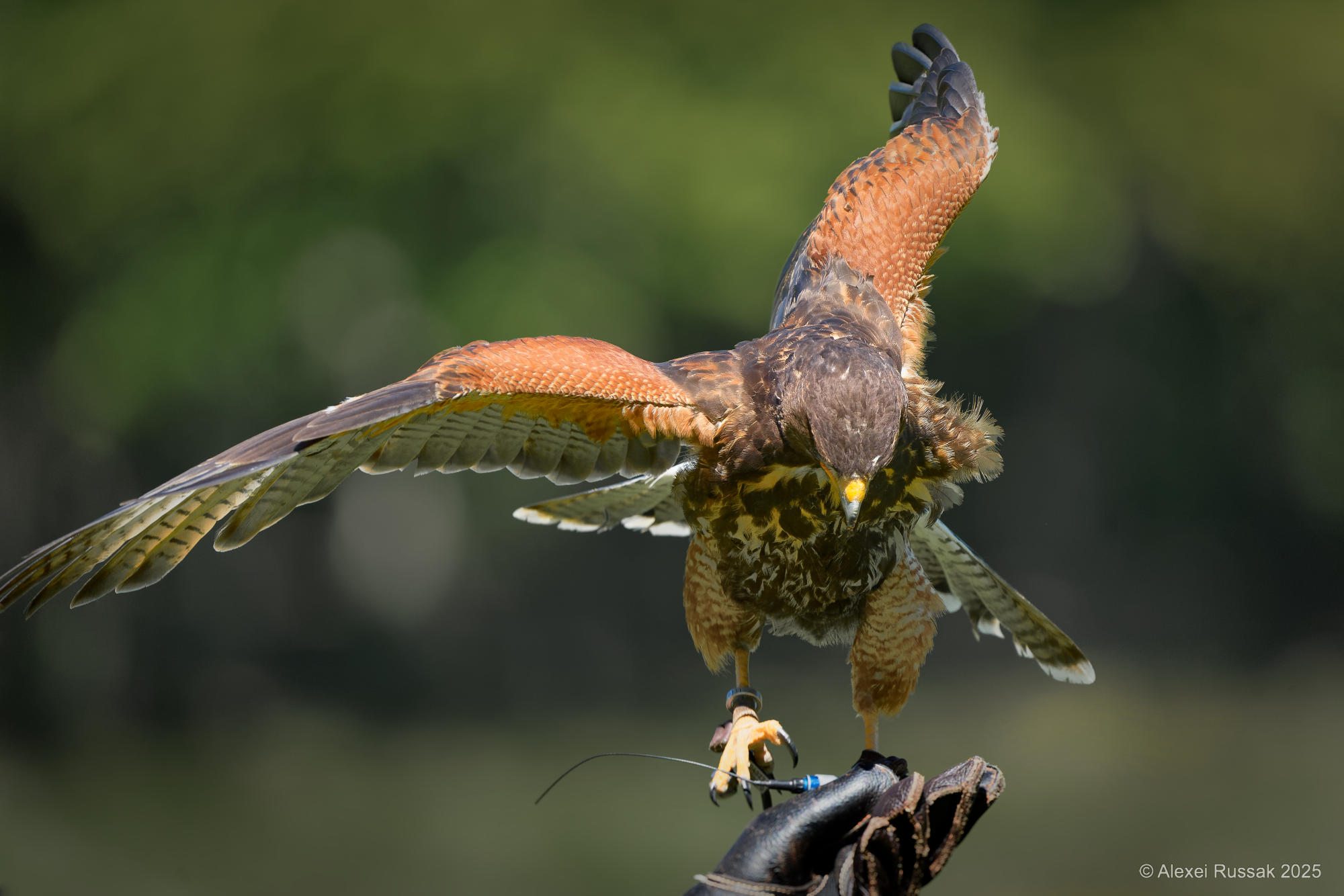 Turmfalke bei der Landung auf dem Handschutz der Falknerin